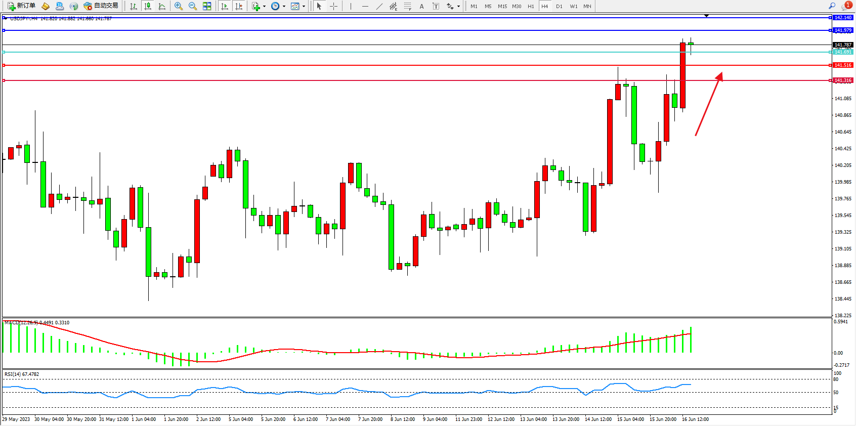 备选策略:141.691下方看跌,目标141.516  141.316