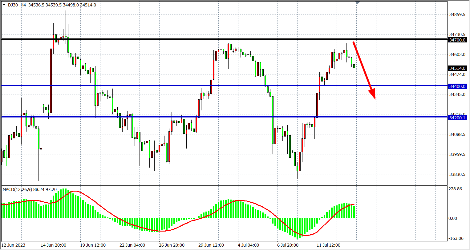 交易策略:34700 下方看跌,目标 34400 34200