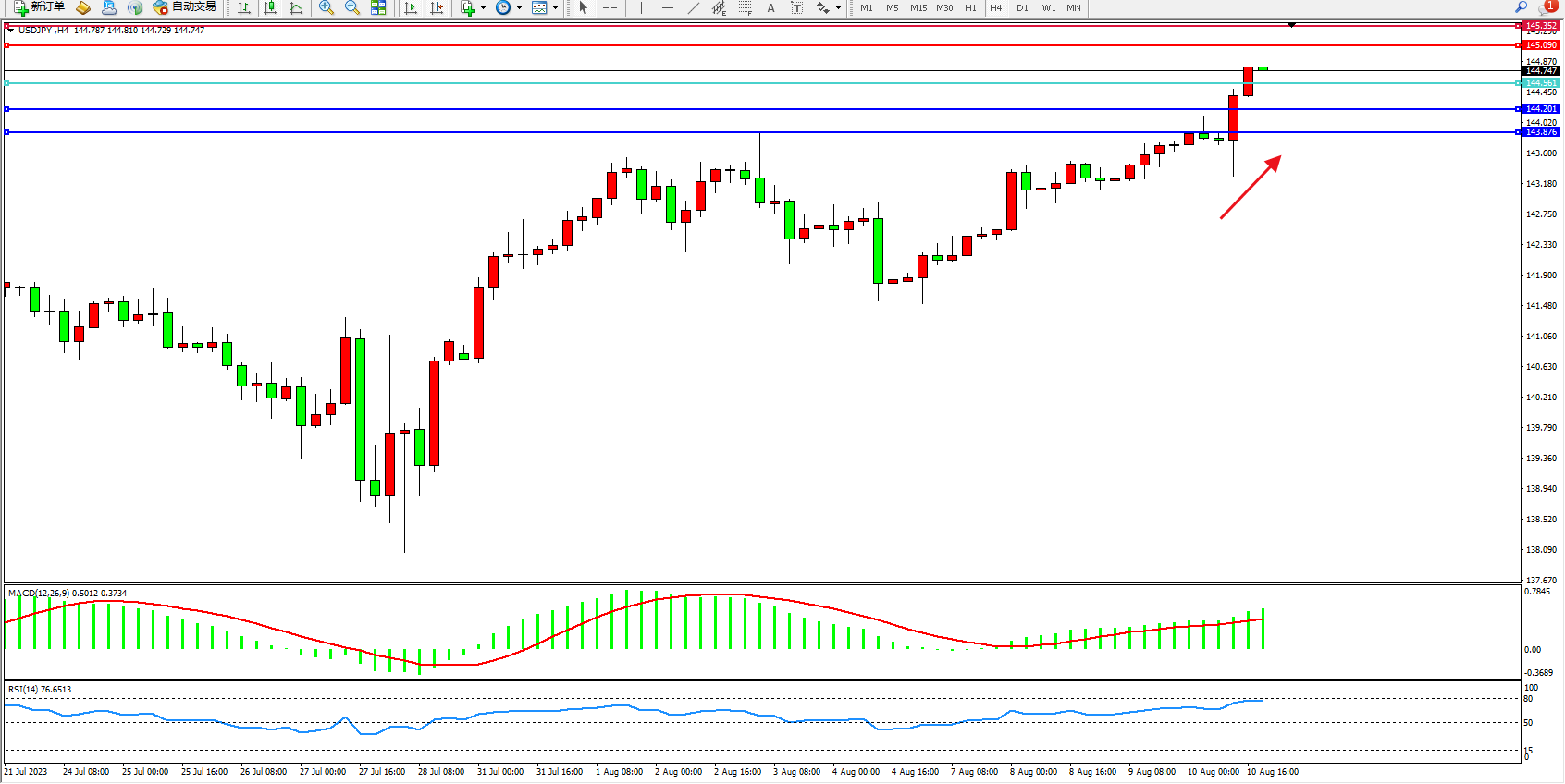 美元日圆USDJPY——4小时K线图显示: