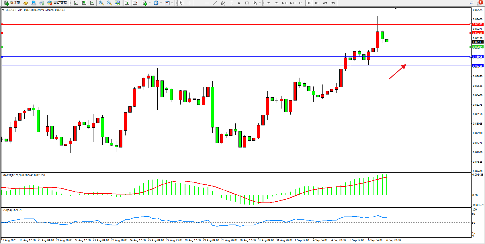 美元瑞郎USDCHF——4小时K线图显示: