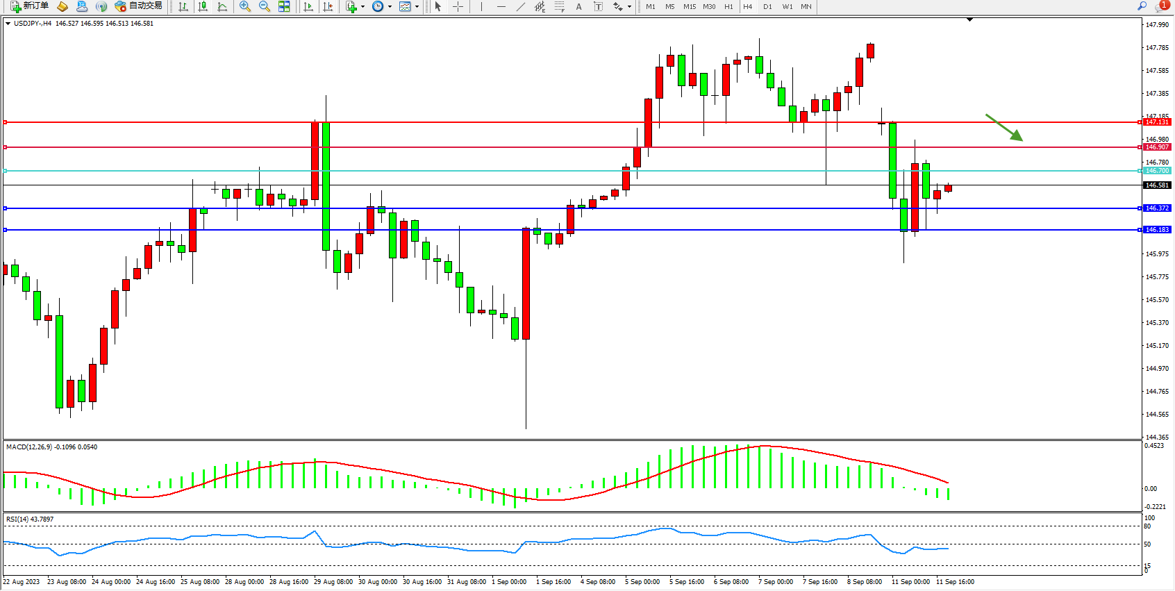 交易策略:146.700下方看跌,目标146.372  146.183