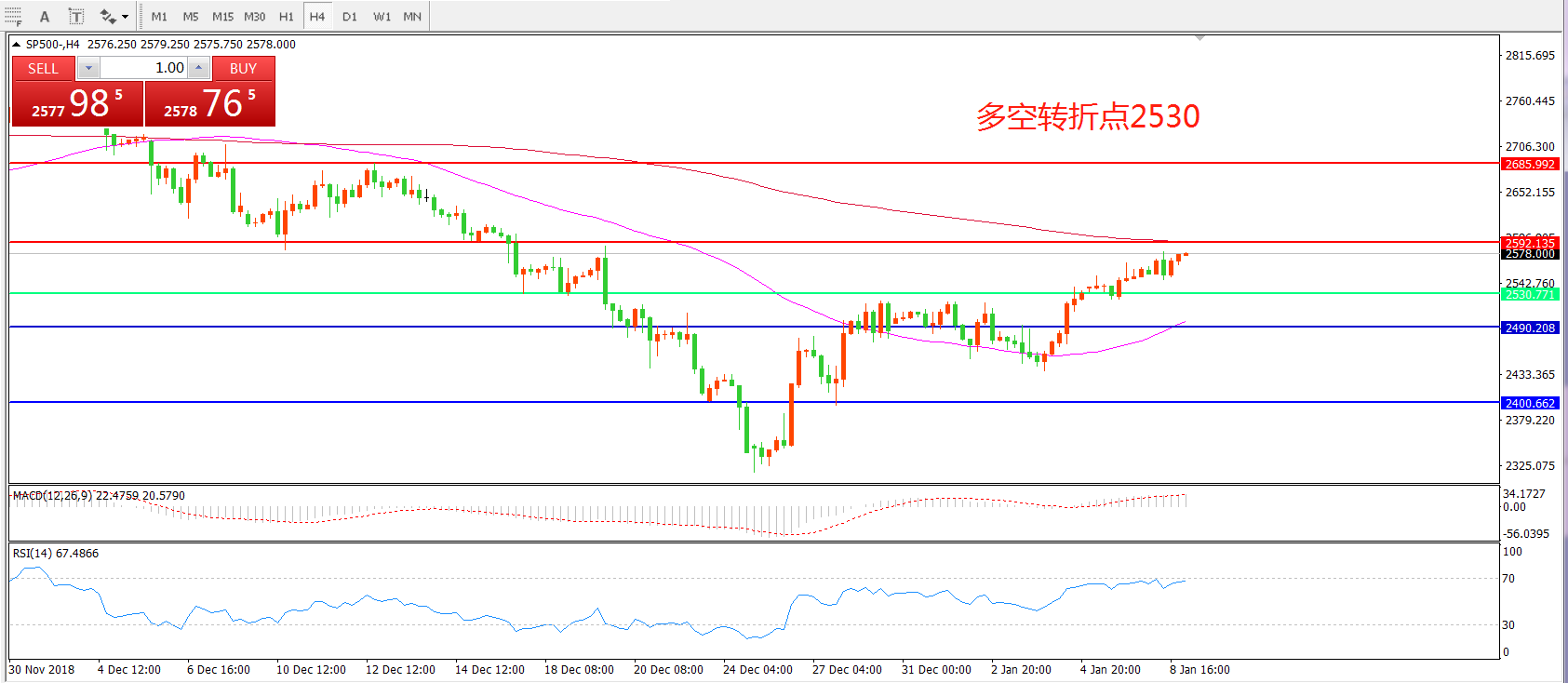 4小时图看,SP500站2490后强势上行,均线系统有拐头迹象,MACD红柱增加,RSI指标出现拐头,短期反弹概率较大。