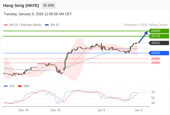 在 26250 之上,看涨,目标价位为 26770 ,然后为 26930 。