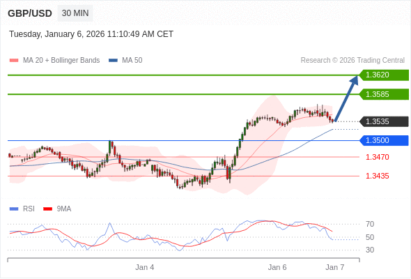 在 1.3500 之上,看涨,目标价位为 1.3585 ,然后为 1.3620 。