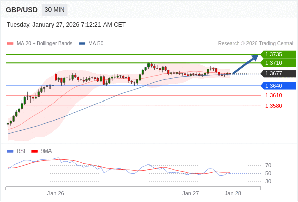 在 1.3640 之上,看涨,目标价位为 1.3710 ,然后为 1.3735 。
