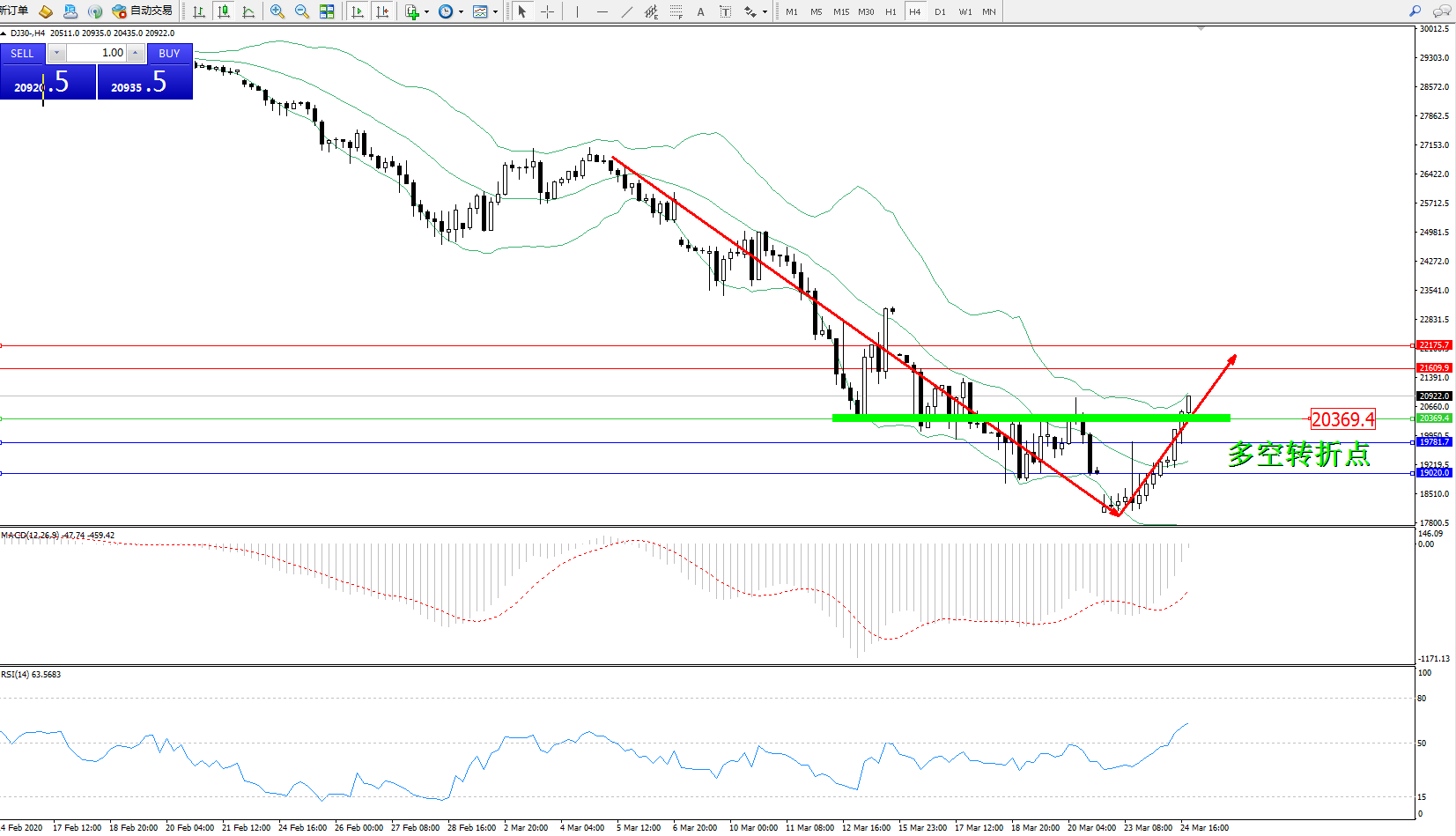 道琼斯指数DJ30—— 4小时K线图显示:
