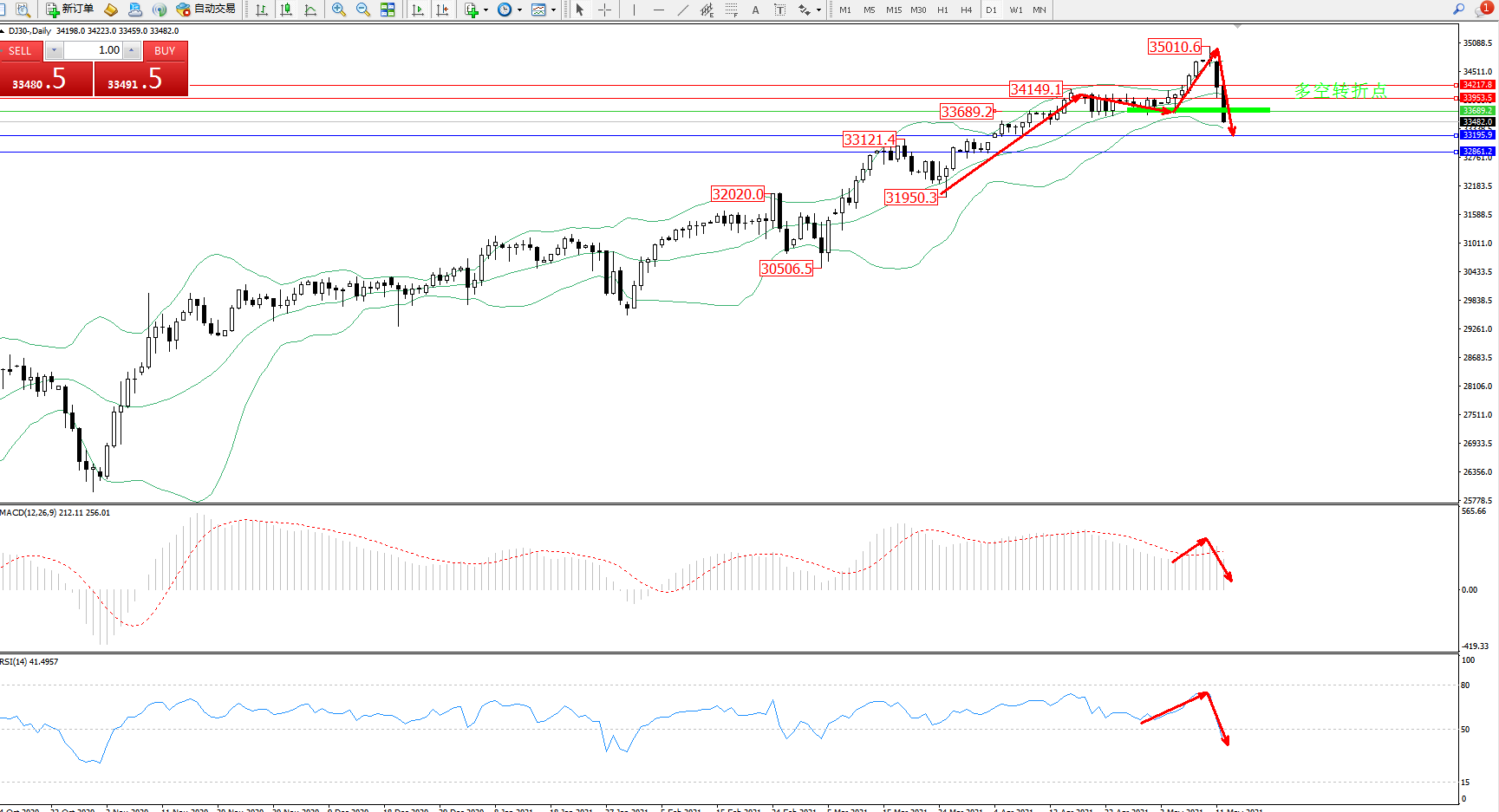 技术点评:多头动力延续布林带指标通道中上轨区间持续震荡上扬,高位抵达35010位置后遇阻回撤,急速下挫后即将触及布林带指标下轨估计节点,空头动力跌势强劲,布林带指标呈缓慢张口走势持续中,MACD指标处于多头区域维持震荡后有向下移动迹象;RSI指标处于多头区域高位急速下挫,破50均衡线进入空头区域不断下移中;