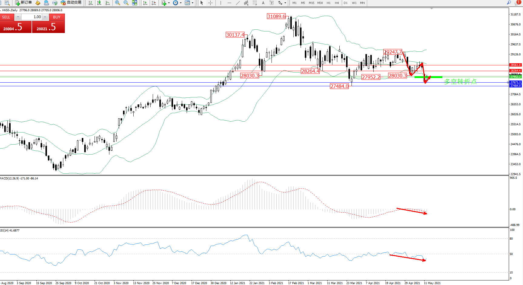 恒指HK50 ——日K线图显示:
