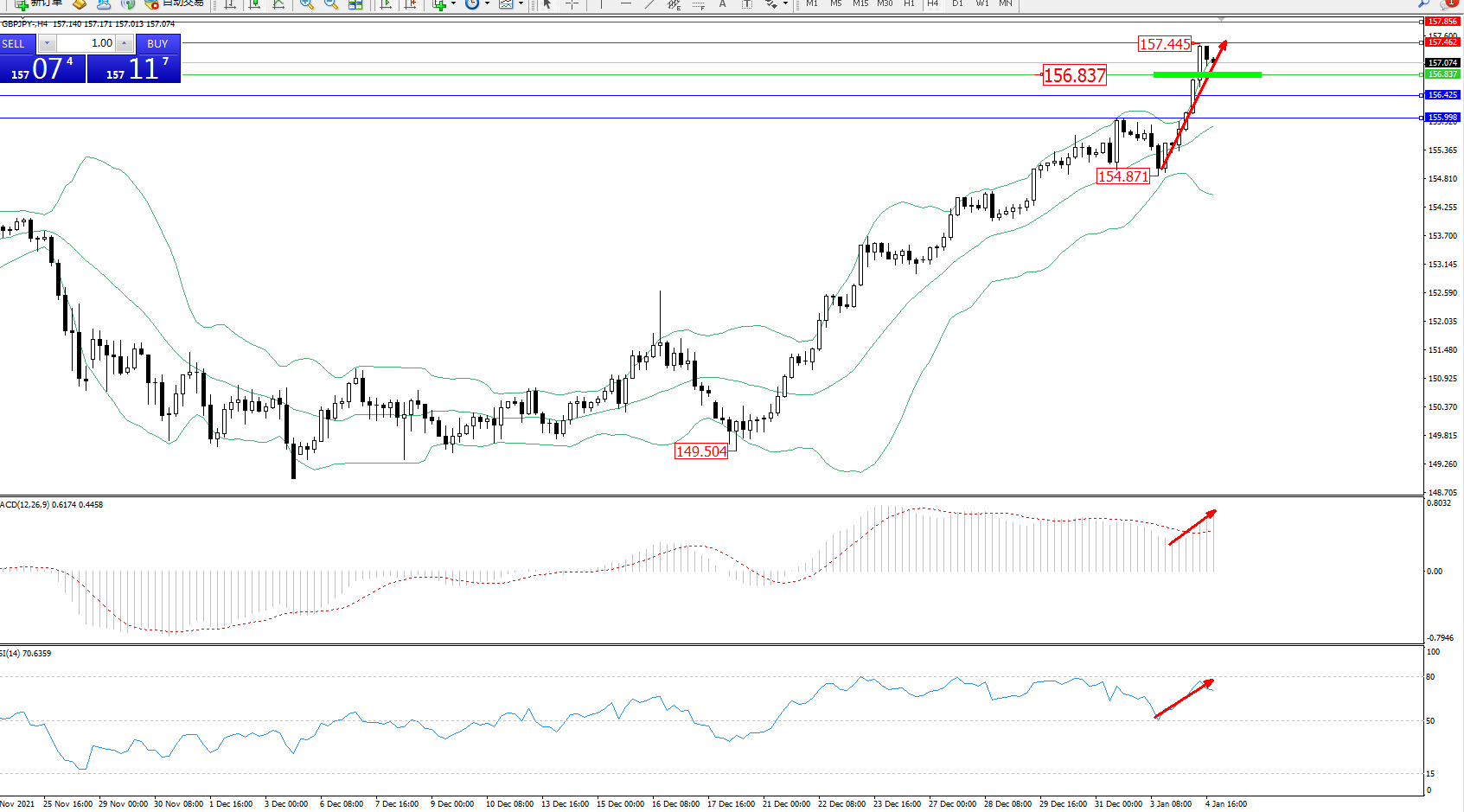 交易策略:156.837上方看涨,目标157.462、157.856