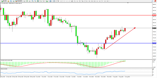 低位多头动力强势震荡拉升上扬,短期看涨情绪或将延续,且多头有继续攀升态势,上方压制中轨1852附近,低位支撑关注1740附近,MACD指标处于0轴线上侧徘徊,RSI指标处于50均衡线上侧整理,如图: