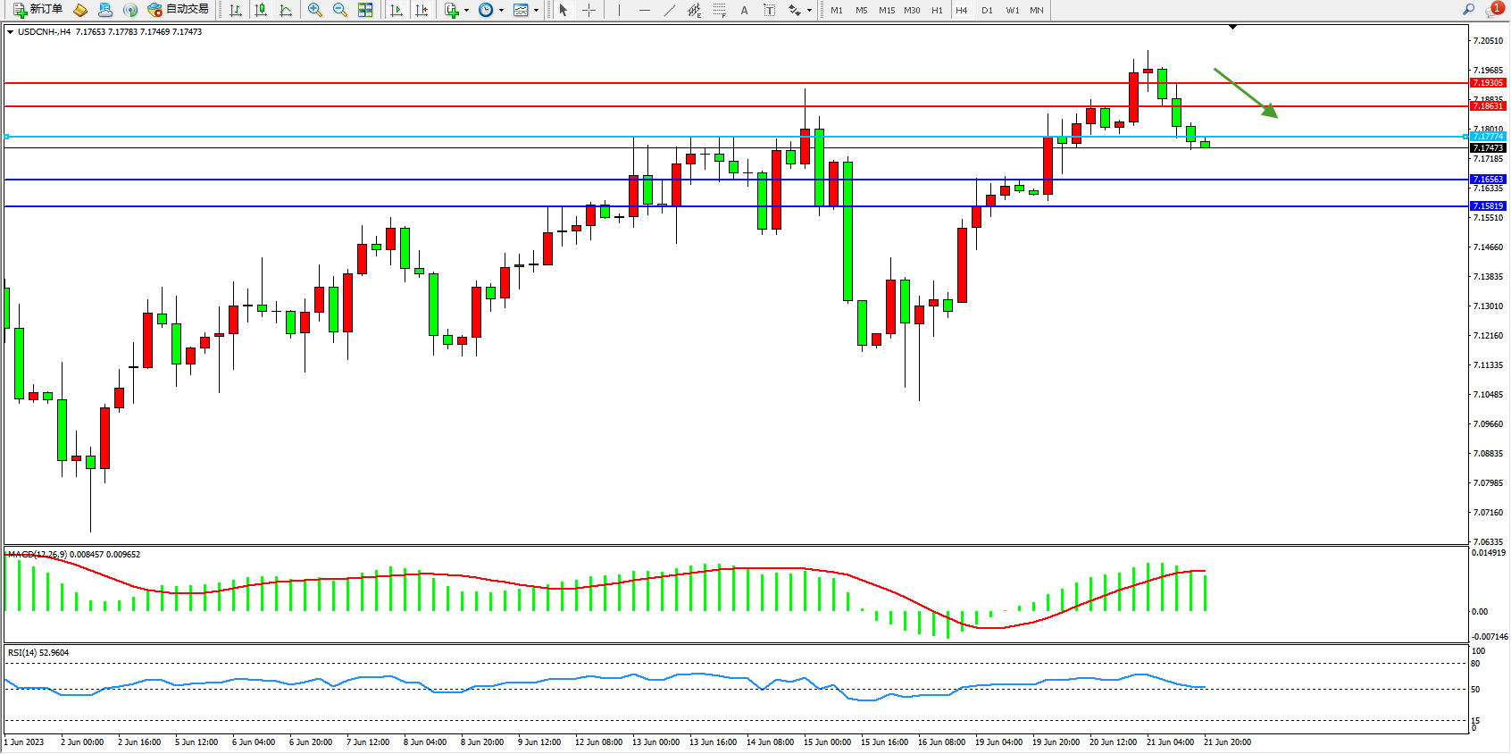 备选策略:7.17774上方看涨,目标7.18631  7.19305