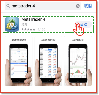 在APP Store,搜索 MetaTrader4,点击“获取”安装即可完成。如下图所示: