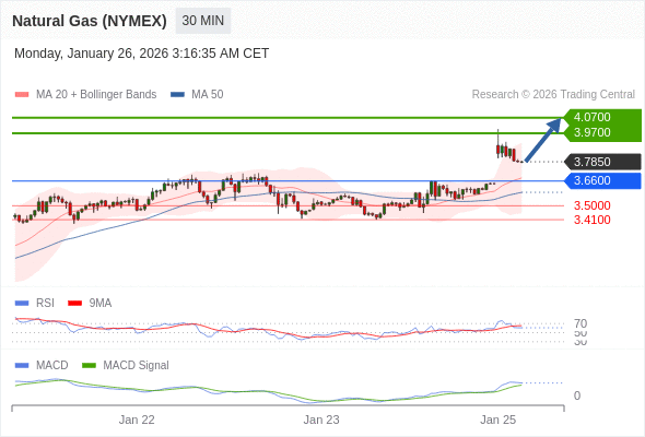 备选策略: 如跌破 3.6600 ,Natural Gas (NYMEX) (MAR6) 目标方向定在 3.5000 和 3.4100 。